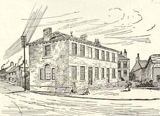 The old Grammar School in the foreground was built in 1834 to replace an older structure, but the school had been in existence since at least 1730. The school was demolished in 1906 to make way for the new Town Hall.