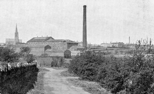 | This is a favourite picture showing how industrial Ossett looked from the Flushdyke area. Douglas Brammer has kindly identified the mills in the picture and the location of the site where the photograph was taken. The picture was taken from the lane leading to Ossett from Flushdyke, across the fields, just after coming through the Three Arch Bridge (as shown in Douglas' Flushdyke Sketches). Nowadays, the scene would be viewed approximately where Longlands Road meets Towngate. The largest chimney in the foreground belongs to Denton's Mill, which was sometimes known as Ings Mill and the building nearest the camera is now Victoria Bathrooms, which is accessed opposite Ossett Fire Station off Dale Street. The other chimneys are thought to be those of Ward's Bottomfield Mill and Scratchard's Mill, off Wakefield Road, opposite Springstone Avenue. The photograph must have been taken prior to 1912/13 because Walter Walker's mill chimney is not present. It was said that Ossett had at least twenty woollen cloth mills in total, many producing mungo and shoddy from rags. |
